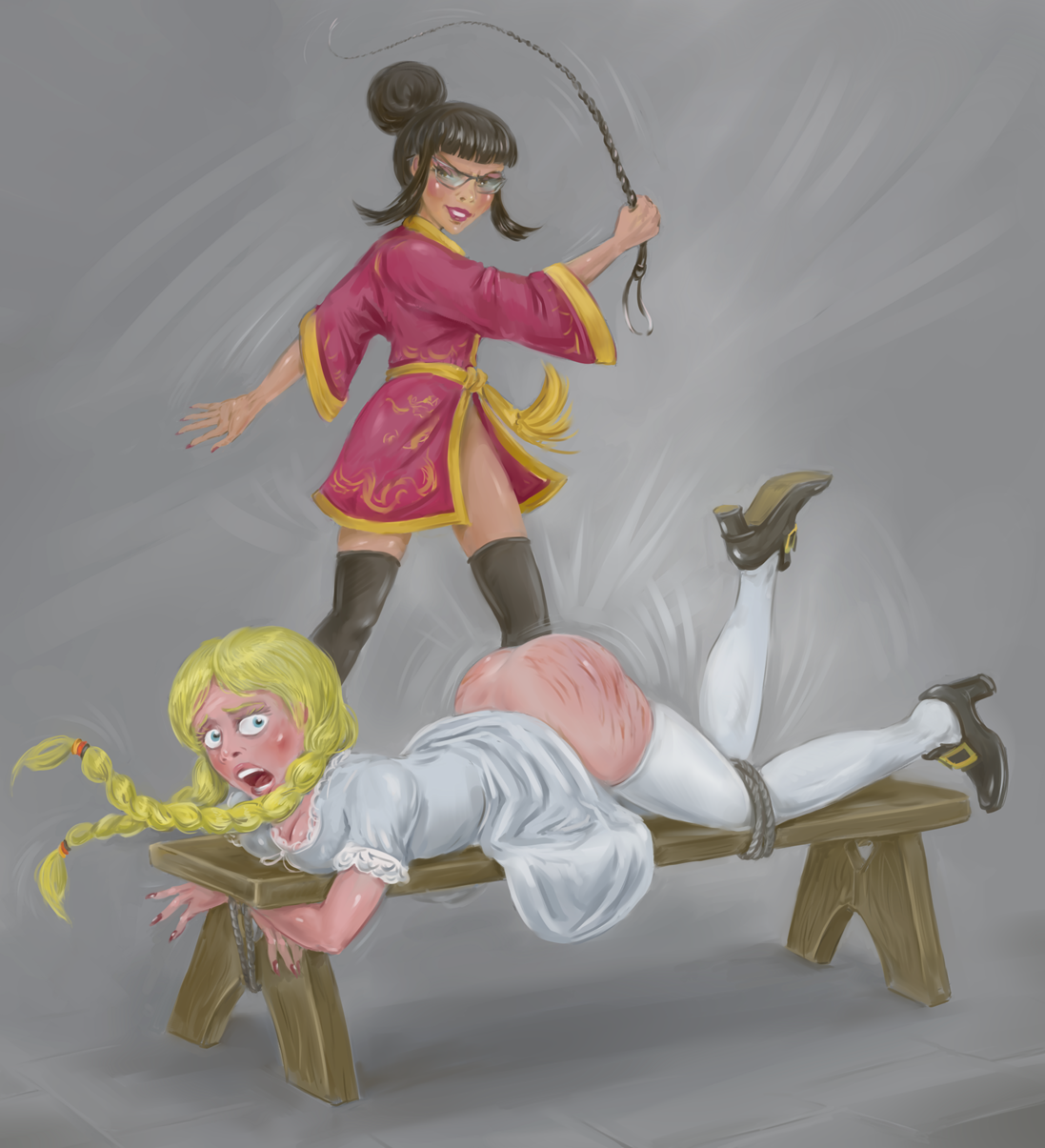 | "Y-you can't do this to me! I'm a German citizen, you have no right to spank me!" "You lied your way into here and pretended you were a citizen from Great Britain." |