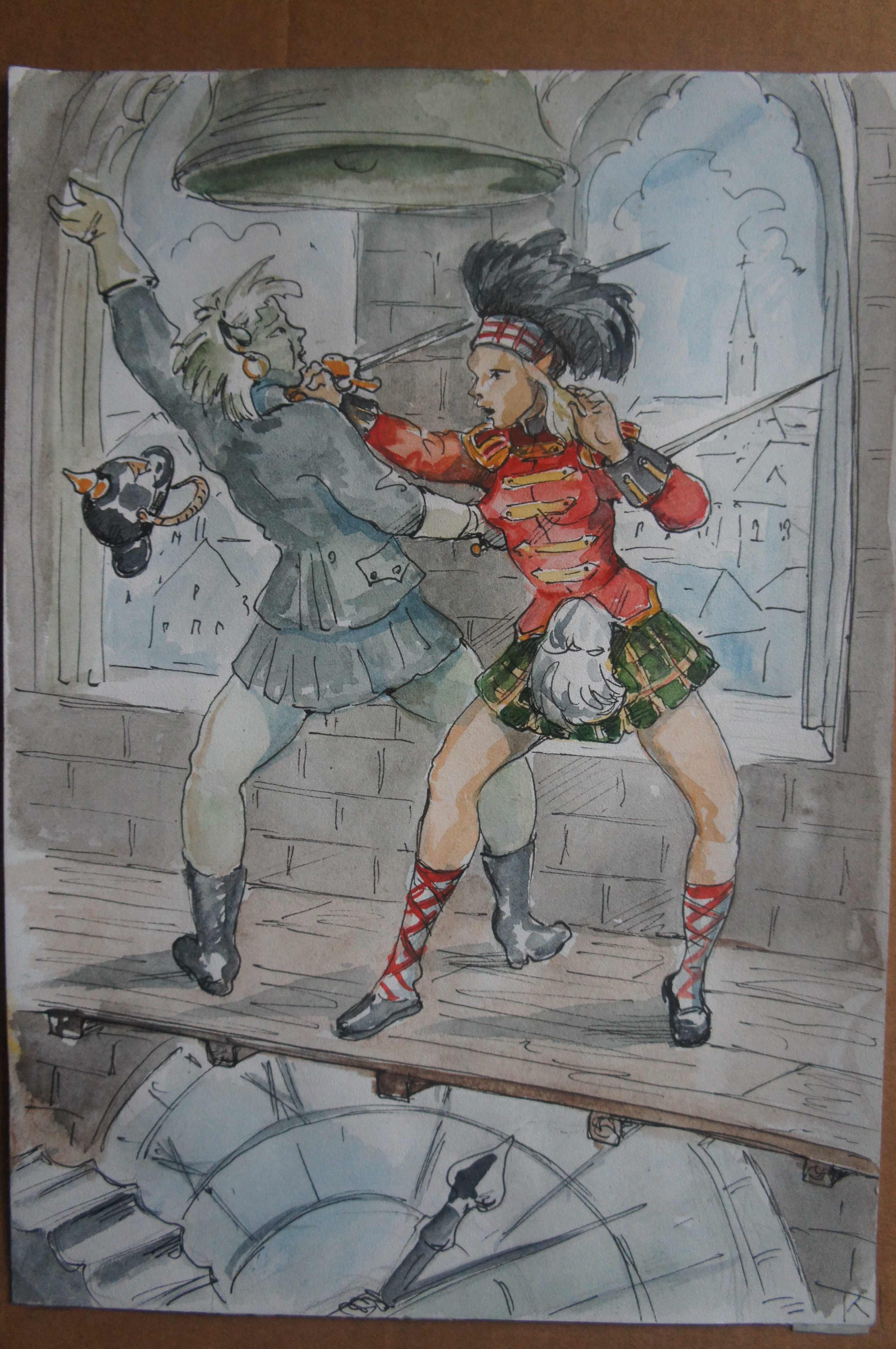 | It was another lazy day in a Wanhold - an old border-town. One day a two young junior officers from a two different countries met in a local pub. An elven girl named Caralda and an orcish girl named Wolffang. After a few pints they started arguing. Word after word and the self-proud girls decided to check each other skills in a duel. The duels were strictly forbidden in Wanhold, so they went to a clock tower, where nobody could interrupt them. |