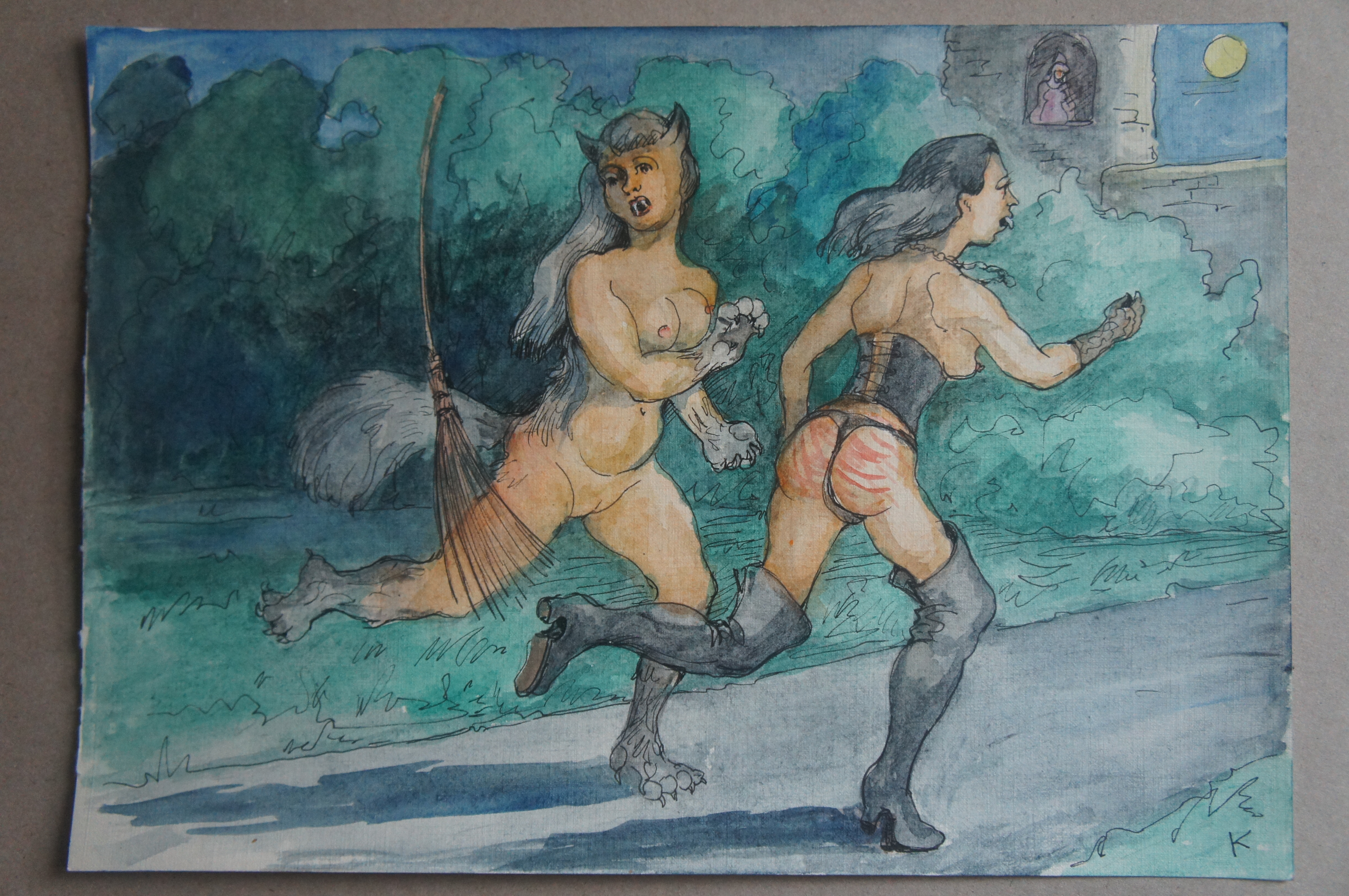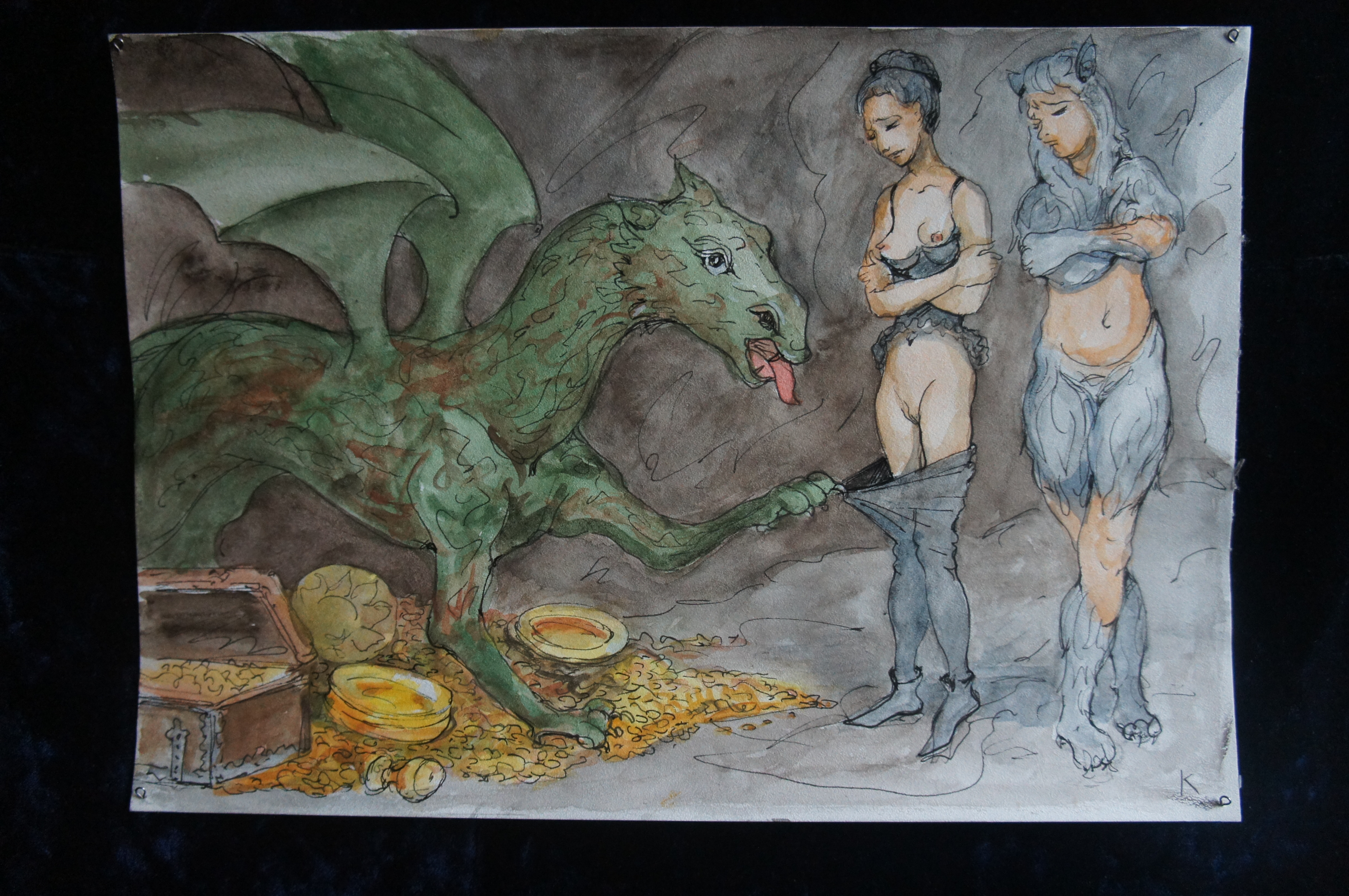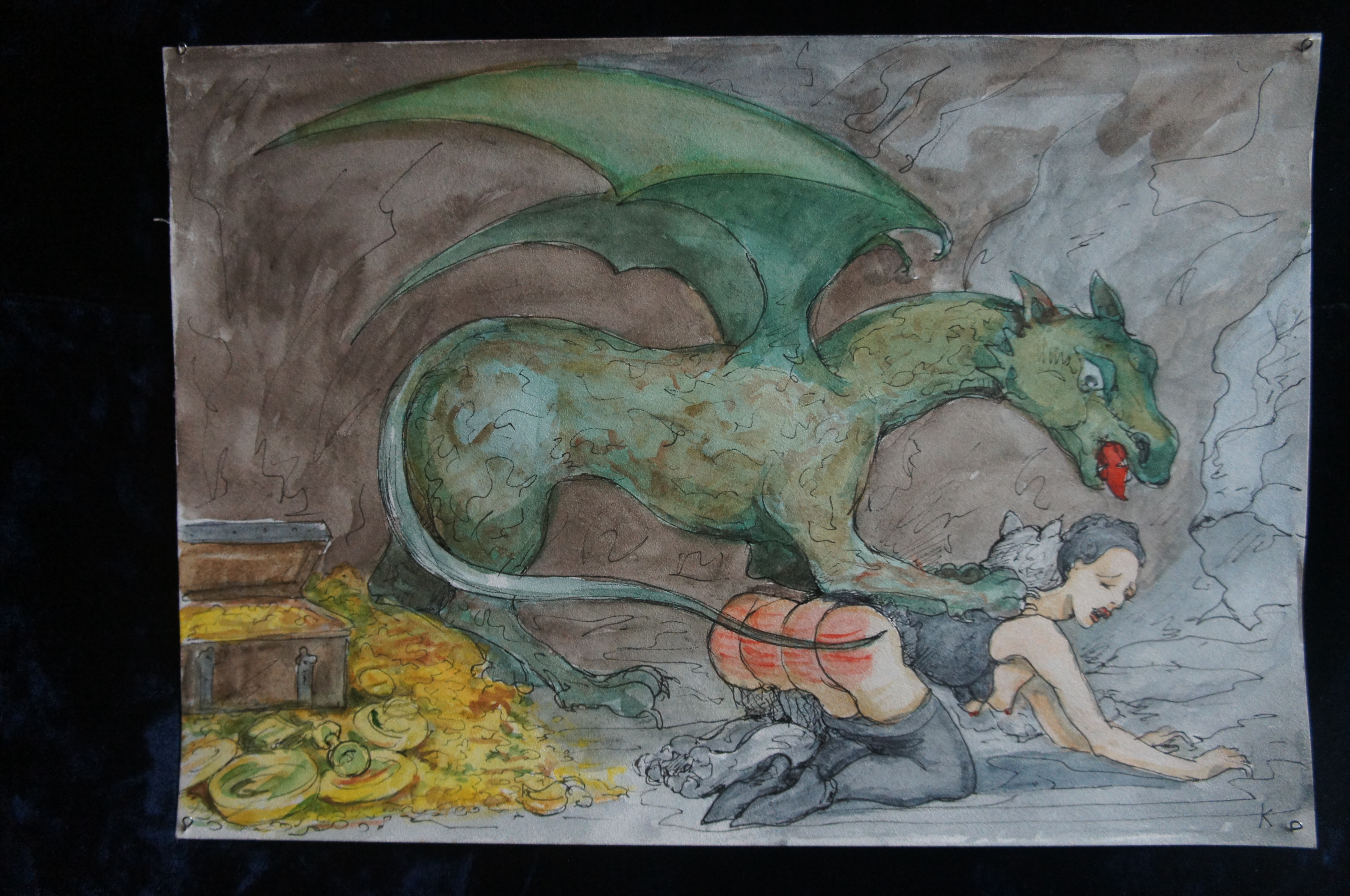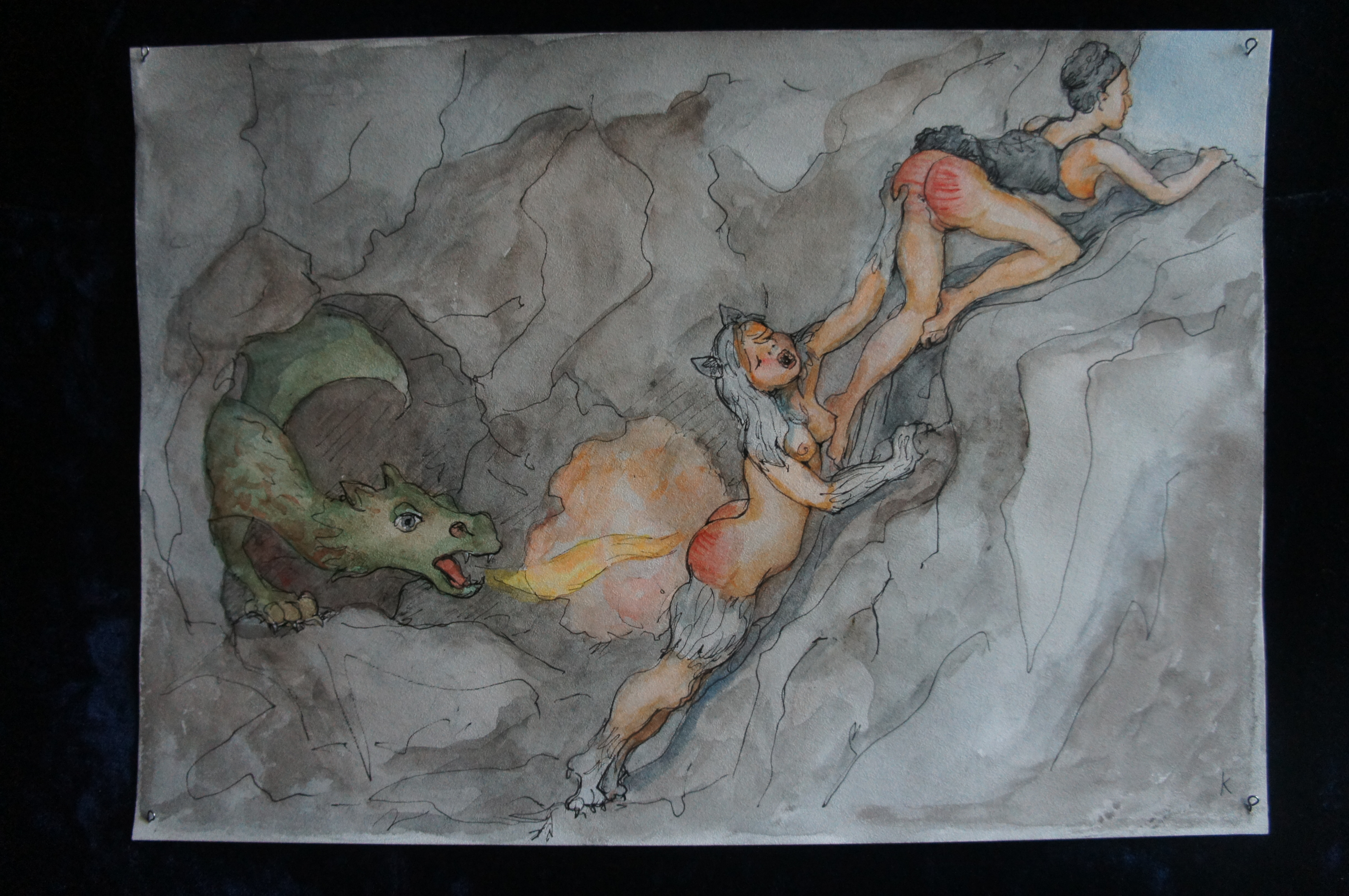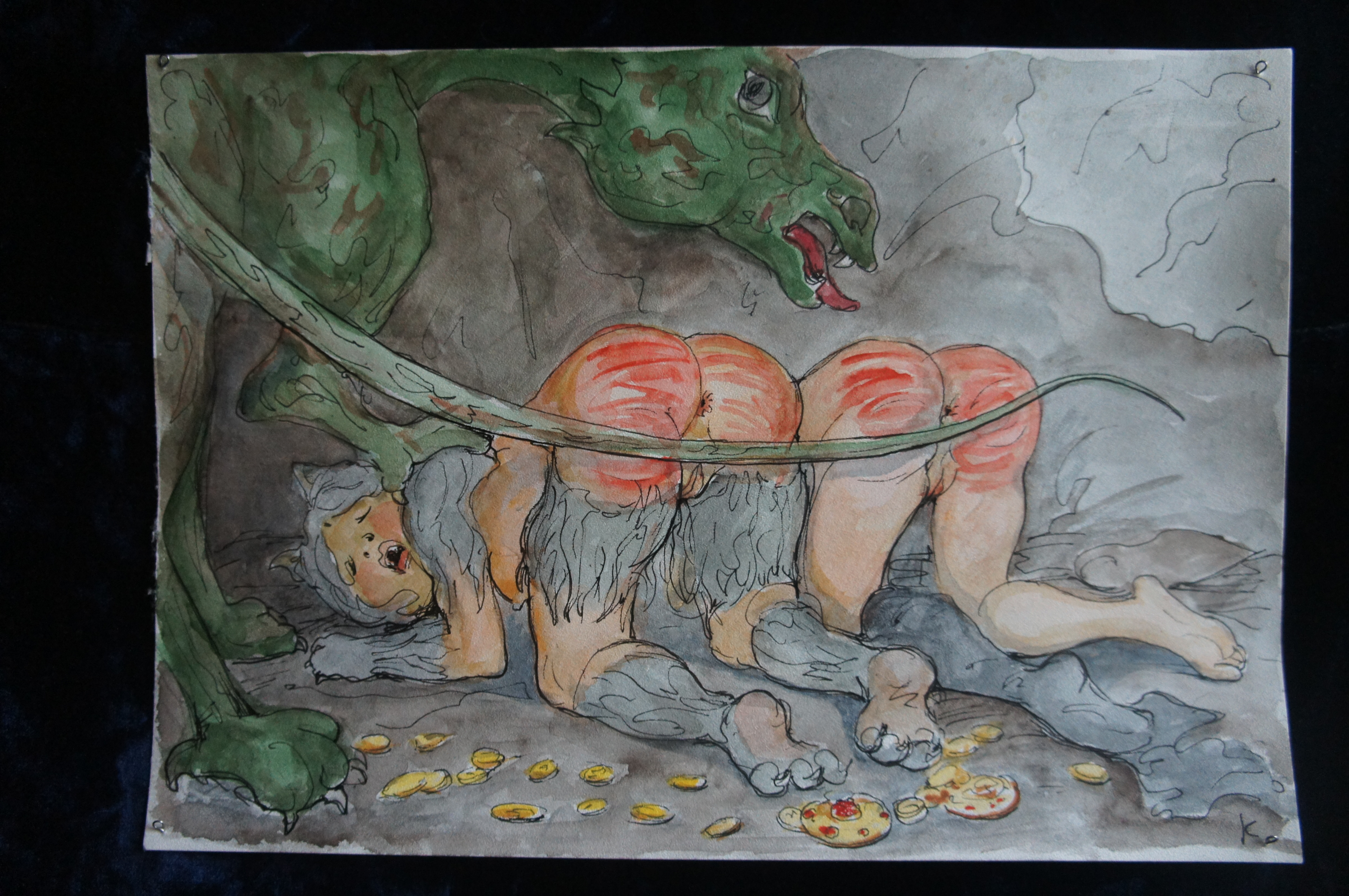 "We're very sorry! Thank you for this lesson, your mightiness!" vampiress said, sniffing. She-werewolf only nodded, bleating. "Good!" the dragon said "And now I will count to five, and if you won't disappear from my lair before I'll end, I'll burn you alive! One!" he exhaled a big cloud of smoke. Vampiress and she-werewolf gasped and ran away as fast as they could, trying not to pay attention to the pain in their backsides. They soon were almost outside, but the cave entrance was hole-alike, so they had no choice but to climb out "Give me a lift! Now!" vampiress commanded. She-werewolf growled, but pushed her friend from behind to help her to climb over a rock. "OW!!! Be careful, you!" vampiress complained, when she-werewolf's paw touched her sore behind. "I try!" she-werewolf excused "Better be hurry!" Suddenly they both heard "Five!" and dragon's head appeared from the depths of the cave. He laughed and exhaled a long tongue of flame. She-werewolf's desperate howling was heard for a miles around the mountains. |