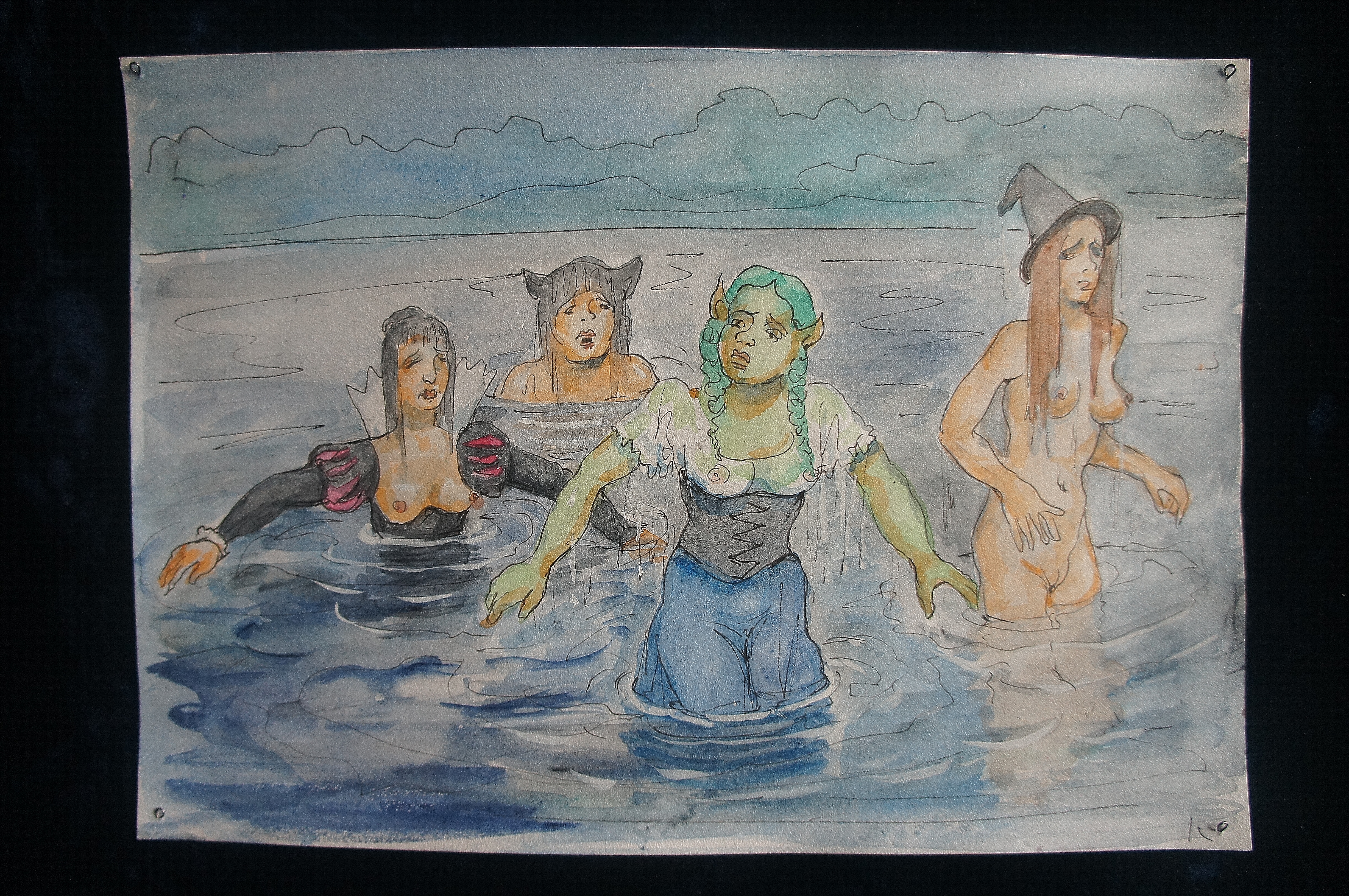 "Ugh! My beautiful dress!" Wolffang lamented, "And all because of this clumsy stupid mutt!" she looked at Dame Athanasia, being almost sure, that the vampiress will allow her to punish her rival. "Because of me?!" Livonna wept, "It was you, wasn't it? You activated that damned machine!" she growled. Dame Athanasia, who was even more angry, but too tired to punish anyone, just shouted: "Shut up you two! You both screwed up and now we are in the middle of nowhere, wet, hungry and with empty pockets! If you will continue this stupid arguing, Kajira would sent your stupid asses on fire literally! Kajira, dear, would you?" the vampiress looked at the witch. Kajira, who lost her mantle, but somehow kept her hat just nodded. She also was too exhausted to use any powerful magic, but she was pretty sure, that her partners in crime couldn't knew that. And Livonna and Wolffang gasped in fear, shutting their mouths.