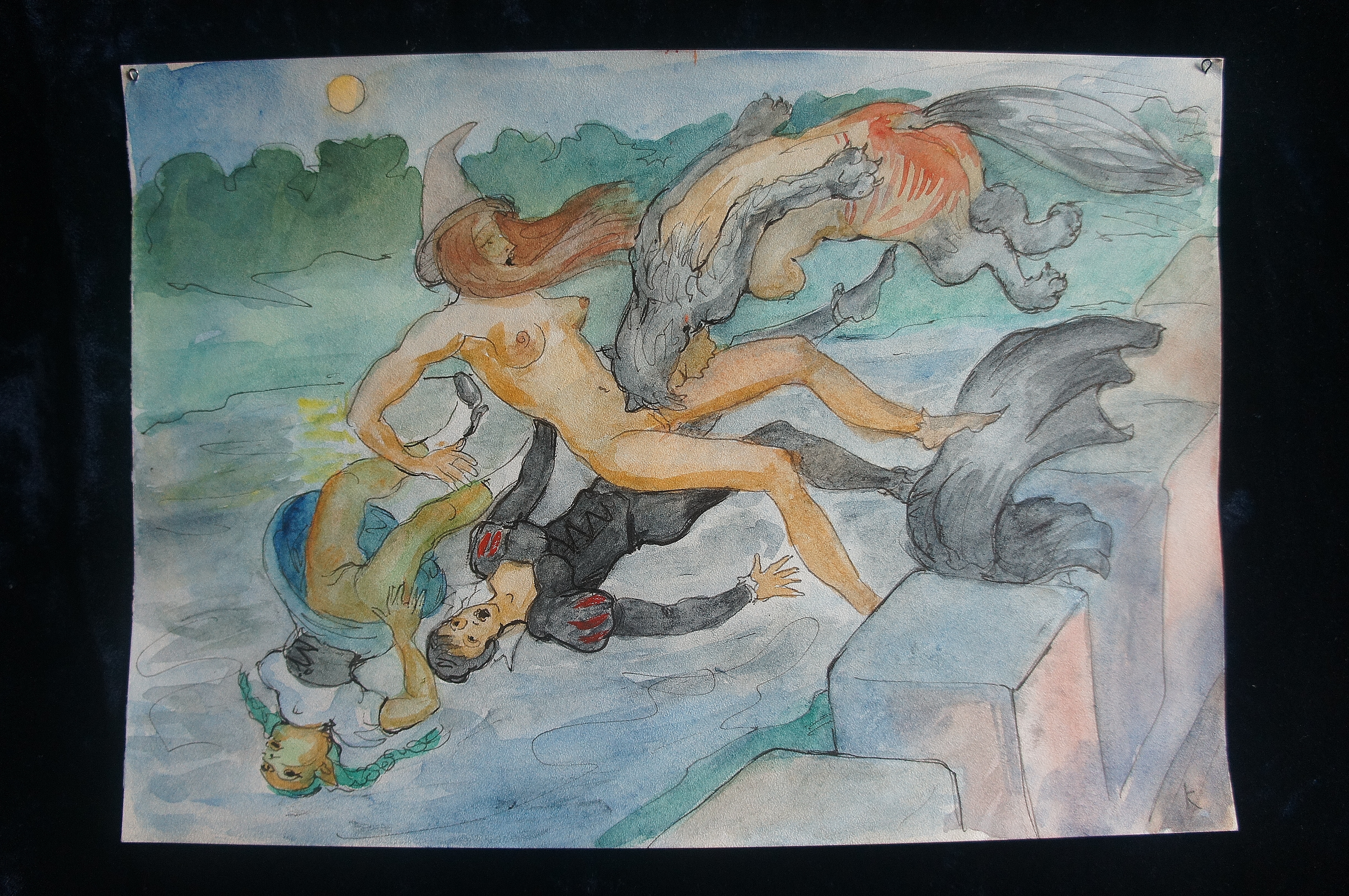 "Well, I didn't got the map, but all is not lost yet!" she said, "As we know, the dwarven chieftain would make a travel to a dwarven city nearby. Without any guards. A perfect victim! I'm recognizing this part of the river, so I know, where we are!" she gave weeping Livonna an annoyed gaze, "Stop sobbing! How dare you to interrapt me! Kajira, please, do something to make this she-wolf shut up!" Kajira nodded and took a bowl of a river water. She whispered a spell and pour it out over Livonna's terrible sore buttocks. "I was never good in healing magic, and now I'm surely not in my best shape, but this should help even a little bit," she whispered to she-werewolf.
