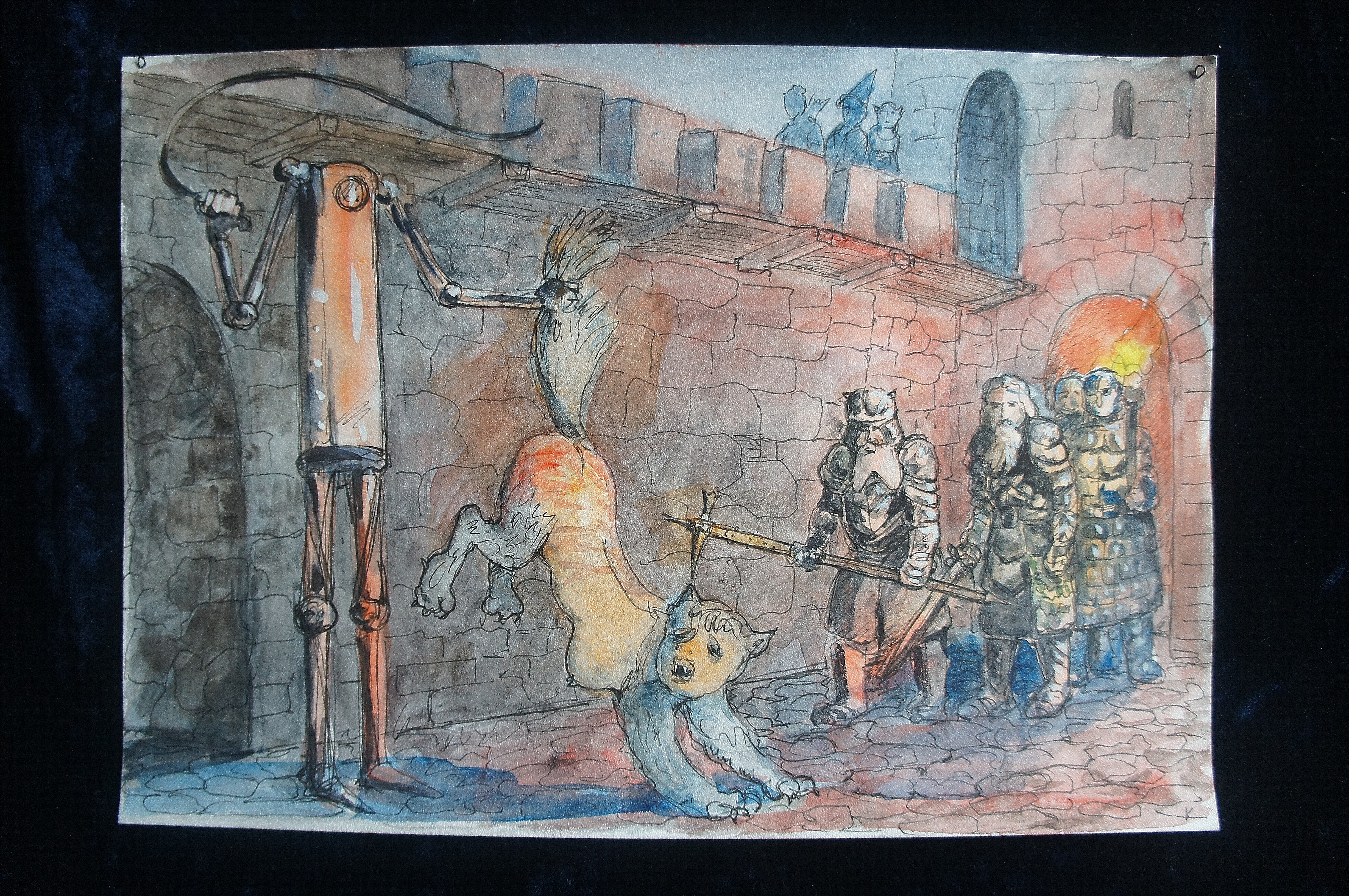 Suddenly the loud tocsin thundered over the outpost, and right from the ground a tall metal figure appeared. The automaton - tireless and relentless dwarven guardian. An enchanted mechanism. It detect the she-werewolf quickly and figured out a solution even quicker. Wolffang hurried to climb back over the wall, watching, how the metal guardian caught Livonna by her bushy tail and raised her rear end high in the air, while raising a whip by it's other hand. The she-werewolf howled in fear and struggled, but all was useless. Powerful machine easily kept her in position. The first crack of the whip blowed over the outpost, and the wolfish howl became much more moanful.