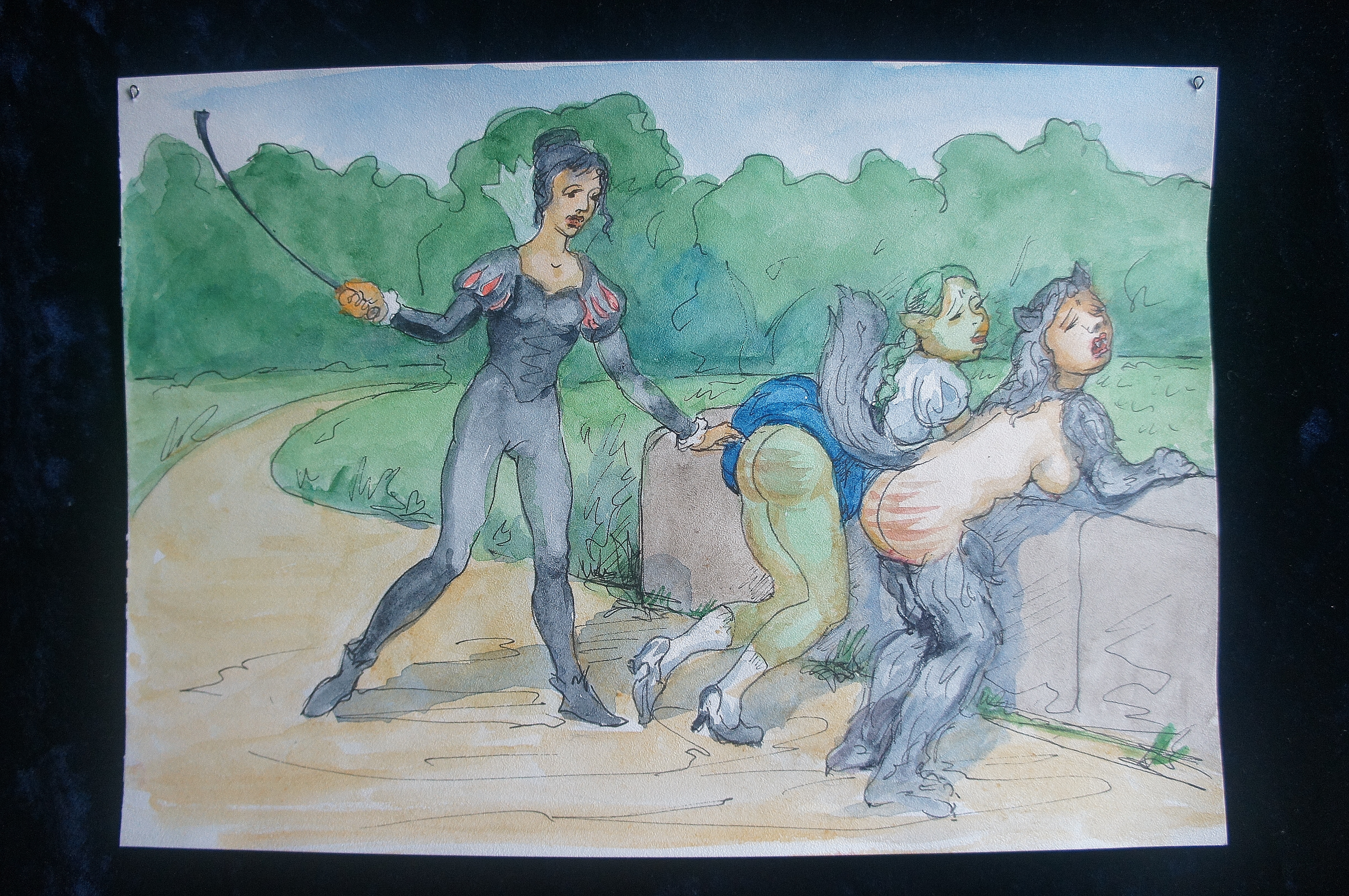 Few seconds later a loud swishing of a riding crop and a girlish screaming could be heard far away around. "You two better to keep in mind, that I will not tolerate any misbehaviour, when it comes to my plans! Your stupid rivalry can wait, until we will get the map! Am I making myself clear?" Dame Athanasia spoken in stern voice giving her companions's upturned bottoms a stinging stroke of the crop at each word. She didn't stopped, until they both started weeping bitterly, apologising, begging for mercy and promising, that they won't start any arguing again. Satisfied, the vampiress threw the crop into the carriage and turned to the witch, who was still gazing at their now very sore and sorry companions. She-werewolf and orcess rubbed their now very sore bottoms, angrily looking at each other, but too scared of another punishment to continue their quarrel. It was quite obvious, that each of them is pretty sure, that it is her opponent's fault, that they got this whipping.