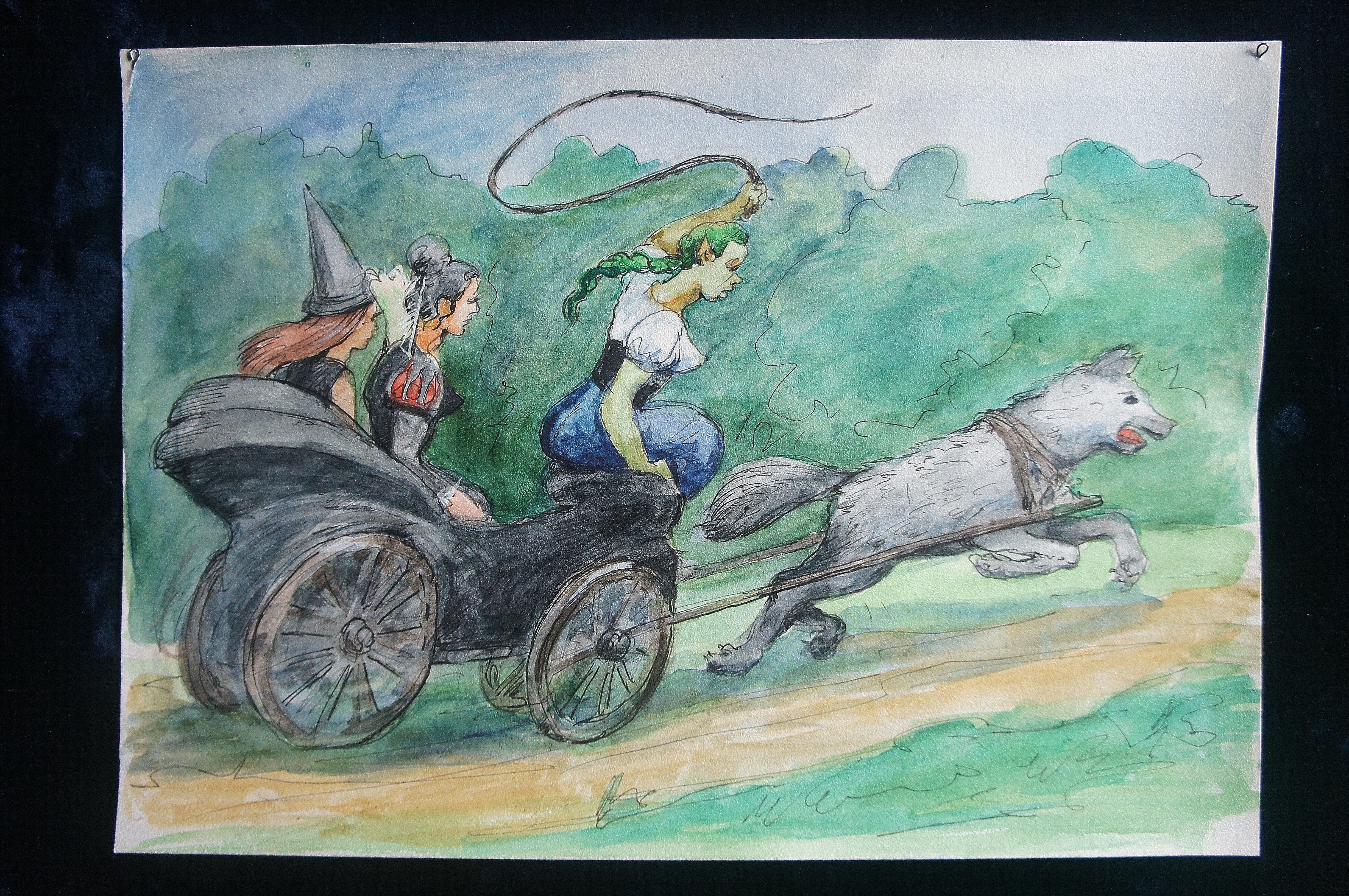 Livonna growled louder, but resignedly stood on all fours and howled out loud, when her body started completing the change. Few seconds later she turned into a large grey wolf. Vampiress smiled contentedly and harnessed her in the carriage. "Take your sits, ladies!" she commanded to the witch and the orcess, "Here we go! Wolffang, you'll be the coachwoman!"