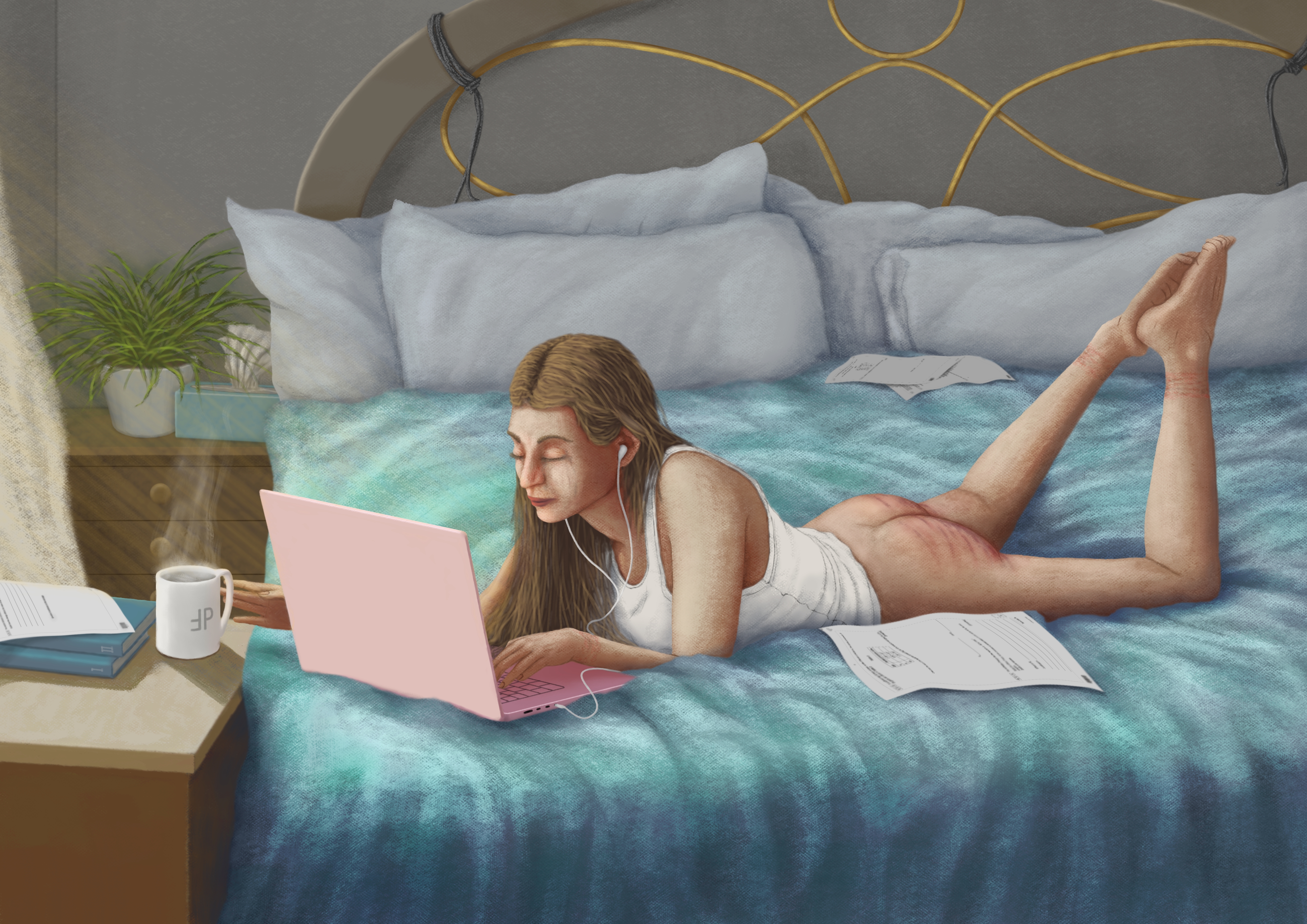 apartment, lying across her bed on her stomach, with an ice pack on her