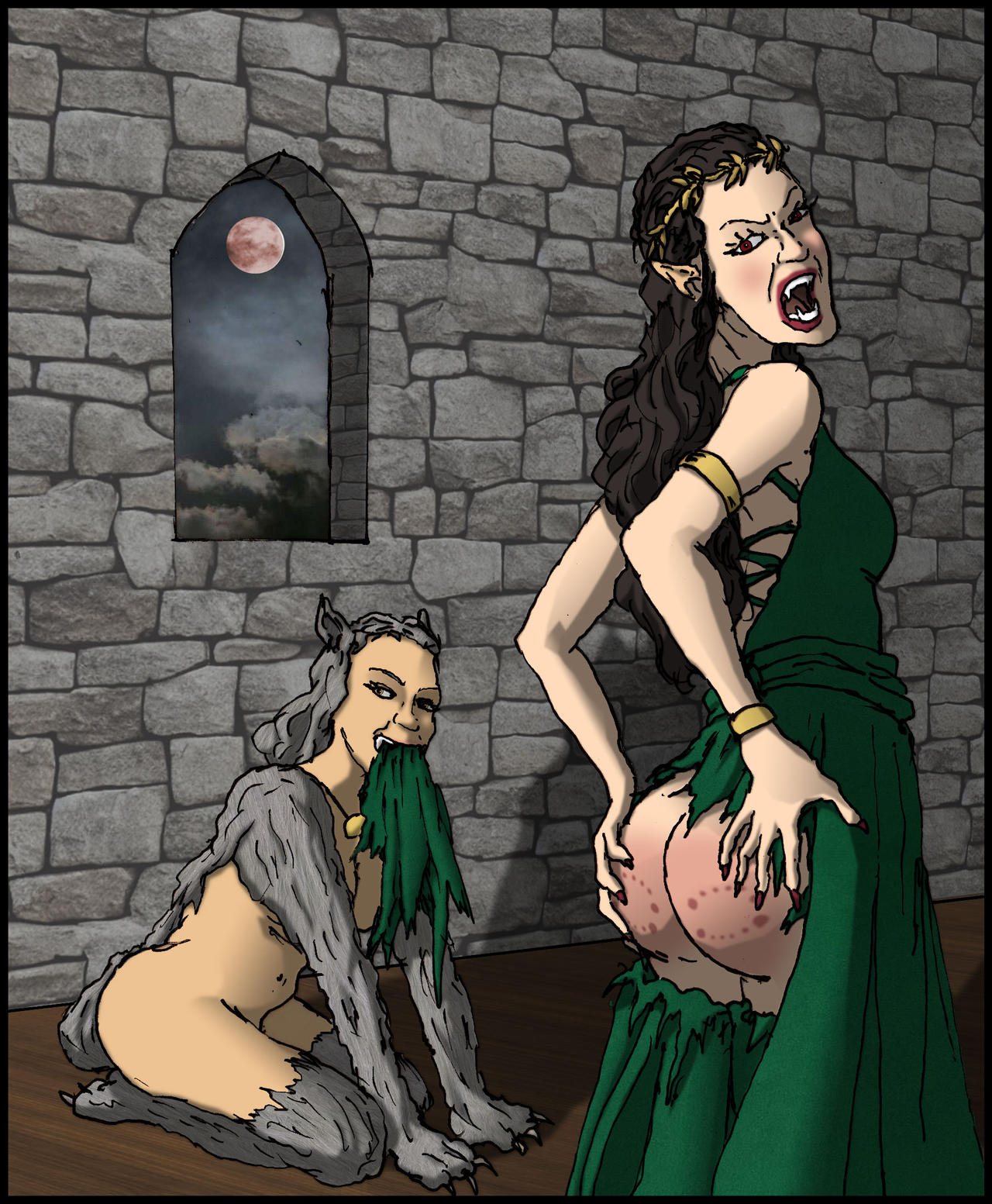 “Maybe THIS will refresh your memory”, Jane said, smiling Devilishly, as she began a brutal assault on the foreign spy’s backside. Jane’s hand cracked like thunder across her big bottom, rising a fiery red handprint under the seat of her elegant black ball gown. Quickly followed by a fuselage of blistering blows, setting the enemy agent’s ass on fire. As the heat began to rise to a nearly unbearable level, Jane was shocked to see her prisoner begin to change, to transform. Her lovely aqua blue eyes became as red as her rear must had been by that point, she grew much larger, stronger, her face elongated into a muzzle, full of razor sharp fangs, and a coat of silvery fur began to cover her entire body. Most shocking of all, a furry tail burst out of the back of her dress, and began to fan back and forth, like it was trying to cool down her red hot rear.
