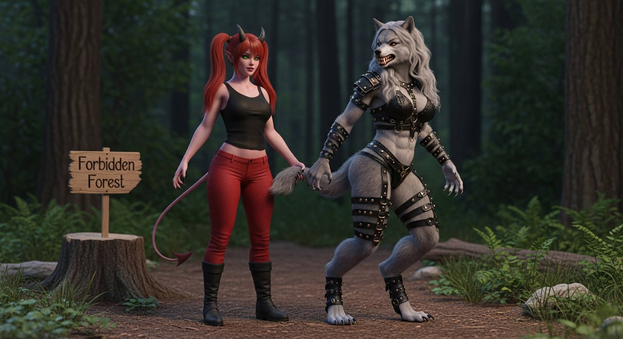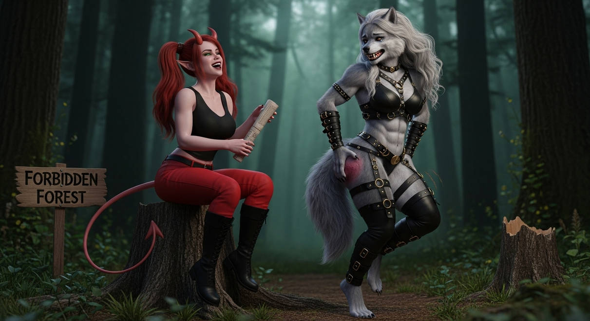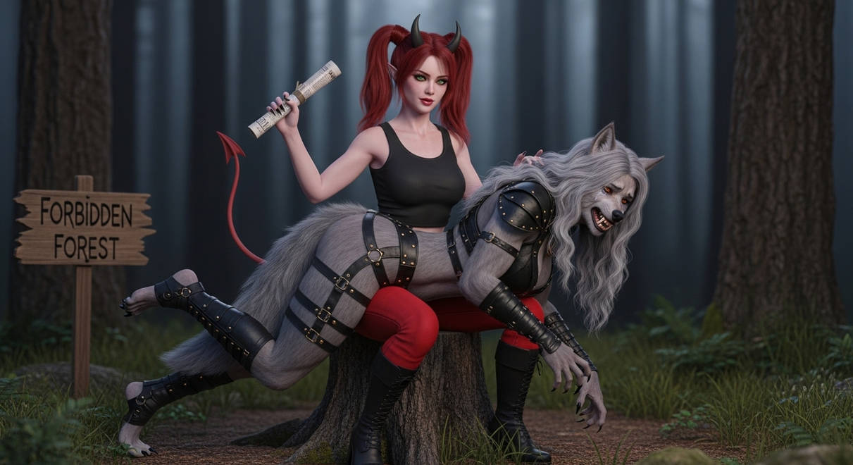 | Livonna jumped up and started jumping and hopping in place in pain, just like she was dancing a kind of a war dance, howling and rubbing her terrible sore bottom. Mina watched her brat war dance, smirking. “You may be a werewolf. Or a she-wolf stuck in that form, I don't care. You don't attack me or even show your teeth at me, Puppy.” “Ugh! Okay, okay, as you say! Ouch!” Livonna whimpered. She continued her dance of pain about a minute or two more, before she could get herself together and finally stop. Mina stood up, walked to Livonna and hit her head with the newspaper, making the she-werewolf growl through the tears. “Allright, what are you doing in my forest? What is your goal anyway?” Livonna pouted. “Just to know what this forest is, and why is it forbidden. Well, the last part I already got, I think…” Mina gave her a strict gaze. “You're a naughty girl, you won't get a free tour. Begone and think about a wiser approach, naughty pup.” Livonna sighed. “And if I'll ask nicely?” Mina smirked. “Funny how you needed a hard spanking to get to this conclusion, hm? So what is the truth ? Villagers and humans are mean with a she-wolf and she wants a sanctuary forest?” Livonna thought for a minute and nodded. “Well, yes…” Mina smirked wider. “And was it wise to insult me, attack me, rebel against that forbidden sign to get it, Puppy?” Livonna sighed and shook her head. “Well... No... Sorry for that…” The demoness opened her side little bag and got out a thin leather collar. “This is the key of my forest to you. The only one. Decide yourself.” Livonna snarled. “To become your hellhound or to be banished from your forest?” Mina nodded. “Correct. You want to stay? That's the collar. So?” Livonna shook her head and turned around to go away. “Thank you, but no. I'll better find my own forest, where I'll be free.” Mina shrugged. “Humph! Suit yourself, Hellhound.” She threw the collar away “Be a nice pup.” Livonna growled and ran out from the Forbidden Forest. Only far away from the forest edge she finally stopped and gave her sore bottom a few gentle rubs. “Ouch! Ouch! Ouch! Ugh! I’d better warn milady that this forest is impassable, and there is nothing valuable… Ow! Ouch! Ow! My bottom! How is it possible to give such a spanking with just some newspaper?! I won’t sit for a week! Ouch!” (Livonna the she-werewolf meets Mina the demoness (who belongs to Minalhan)) |